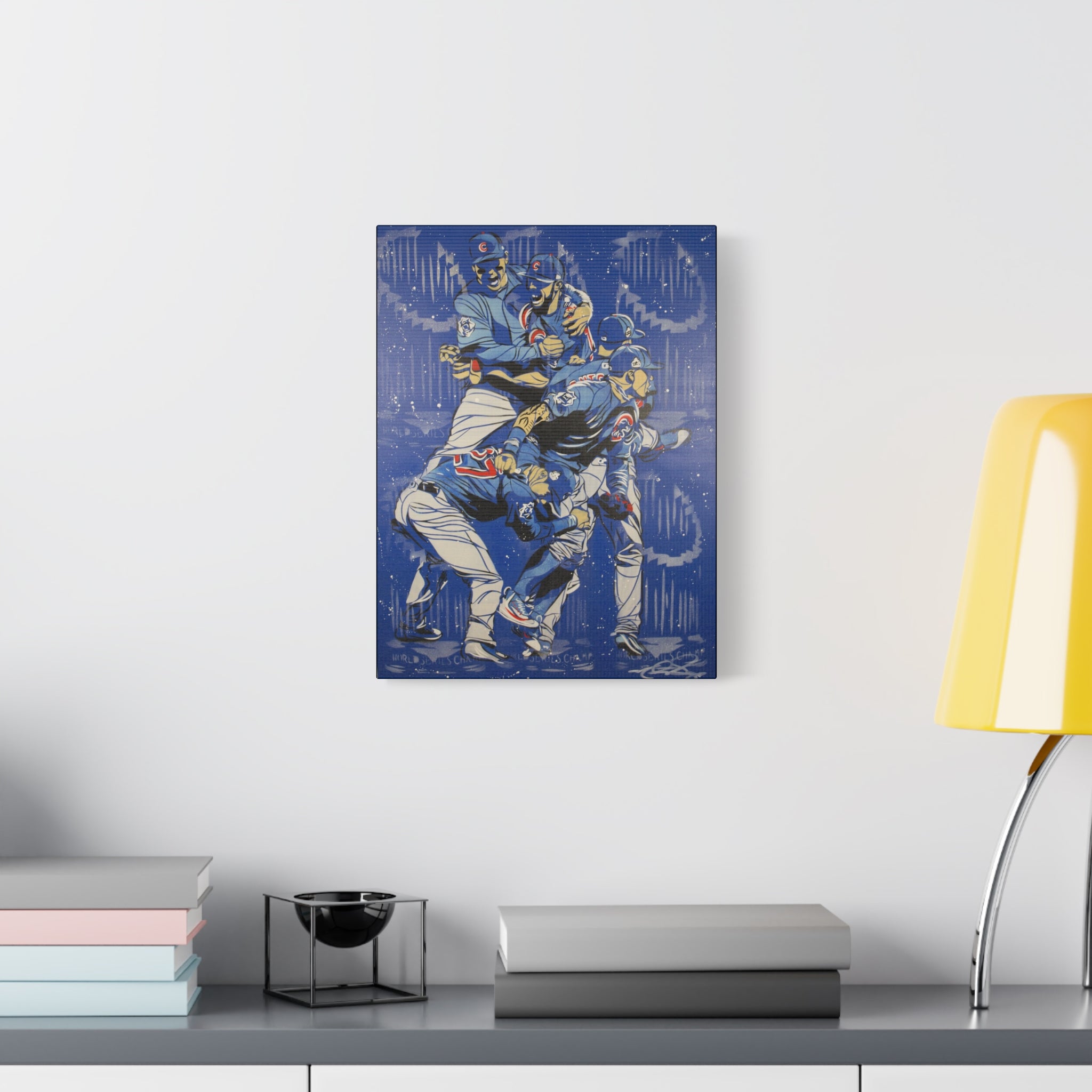 High quality stretched canvas print of former Chicago Cubs outfielder and artist Matt Szczur's depiction of the iconic 2016 World Series final out celebration photo.